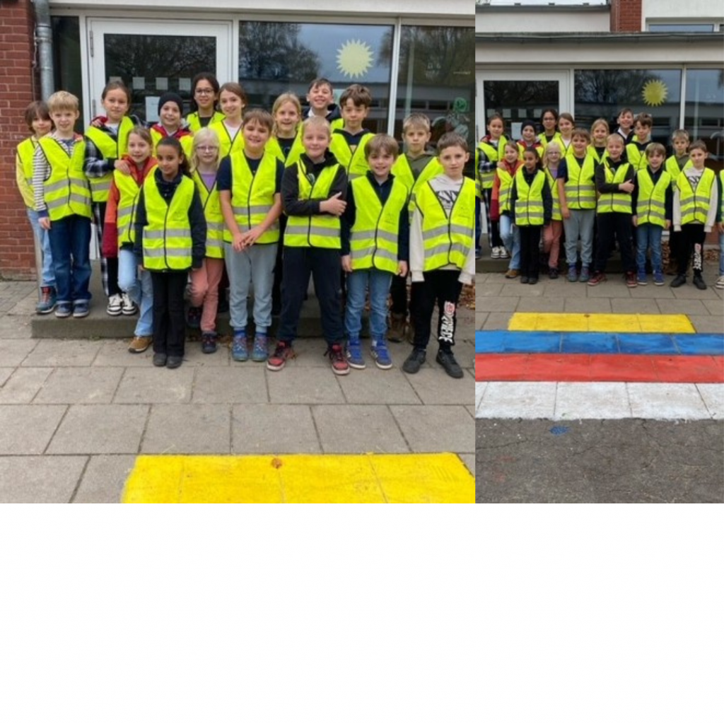 Unsere neu ausgebildeten Friedenskinder sind einsatzbereit! Wir danken dem Förderverein für die gut sichtbaren Westen! Die Friedenskinder unterstützen andere Kinder bei der Streitklärung in den Pausen. Dies tun sie mit Hilfe der Friedenstreppe auf dem Schulhof. Danke auch an Frau Erlemeyer, die mit den Fiedenskindern der 4c der Treppe einen neuen Anstrich verliehen hat.